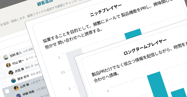 メールの閲覧履歴・メールのへの内容評価から自社商品・サービスに興味ある顧客を選別し、顧客の興味・関心・思考パターンを探りながら、次なるメールを配信し、これまでのただ送って反応を待つだけの営業メールから完全脱却します!