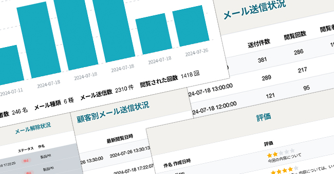 メール配信後、開封率、評価、解除状況、閲覧回数を管理画面で確認しながら次のメール戦略を立てます。